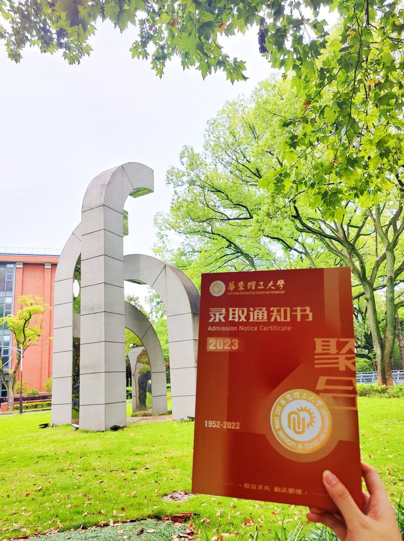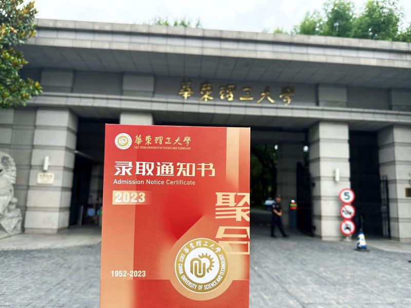 通知书封面设计融入了中国传统纹案“回纹”和分子聚合、校徽等多种元素。通知书内页正面以文字形式聚合了华理学子的能量、未来和高光,背面是华理校门手绘插画和校训“勤奋求实,励志明德”,传递了学校对新生未来吉祥延绵、砥砺前行的美好祝愿。