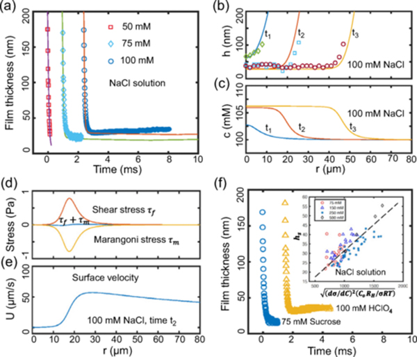 刘博特聘副研究员采用自研仪器,创新地观测到了气泡靠近过程中所形成微纳米液膜的动态薄化过程,电解质溶液中气泡呈现出一个与清水截然不同的两阶段合并:起初气泡靠近规律和纯水中相似,但当距离减小到大约40纳米时,接近表面的“前缘”就会因某种排斥力而变平。结合实验观测及理论建模,他提出了一种纳米尺度溶质输运理论模型,在不引入任何拟合参数的前提下解释了这种特殊的“两段式”液膜薄化过程。