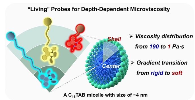聚集体的微观性质是非常具有挑战性的研究课题,比如胶束内部的微粘度仍存在着诸多争议。基于不同的测试方法,部分观点认为球形胶束内部是液态,而另一部分观点则认为是固态。理论计算已经证明球形胶束内部的碳原子密度从核中心到壳层是逐级降低的,因此可以预期球形胶束内部的微粘度也是从核中心的高粘度逐步降低到壳层附近的低粘度,然而目前还没有实验对这种梯度变化进行定量验证。因此,基于新的检测机制,开发合适的工具用以探究胶束内部与深度相关的粘度成为十分迫切的需求。