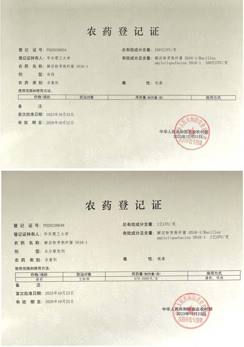 华东理工大学获得的2个新农药登记为生物反应器工程国家重点实验室王伟教授团队研发的新型生物农药:100亿CFU/克解淀粉芽孢杆菌SN16-1原药(登记证号PD20230654)和1亿CFU/克解淀粉芽孢杆菌SN16-1水分散粒剂(登记证号PD20230649)。