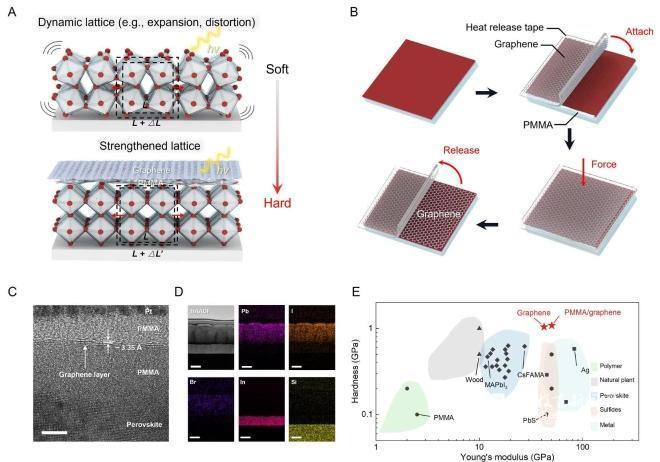 该研究发现了钙钛矿光伏不稳定性的关键机制——光机械诱导分解效应,提出石墨烯-聚合物机械增强钙钛矿材料的新方法,制备的太阳能电池器件在标准太阳光照及高温下的T97工作寿命创下3670小时新纪录,该研究成果将为钙钛矿太阳电池的产业化应用提供全新解决方案。