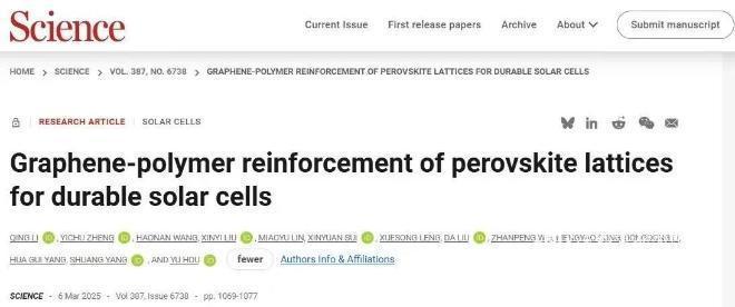 钙钛矿太阳电池作为极具应用前景的新型光伏技术,而器件不稳定性是限制其产业化发展的首要挑战。3月7日,华东理工大学材料学院清洁能源材料与器件团队侯宇教授、杨双教授等人在Science(《科学》)发表题为“Graphene-polymer reinforcement of perovskite lattices for durable solar cells”的最新研究成果。