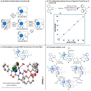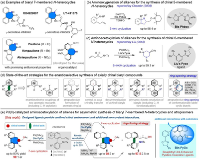 含氮杂环和联芳基单元广泛存在于天然产物和生物活性分子中,将这两个子结构融合成一个联芳基桥连的中等大小的环,就形成了一类具有独特结构、构象和生物学特性的环状化合物。联芳基桥连的环状化合物也存在于天然产物、生物活性分子以及有机催化剂中。过渡金属催化的非活化烯烃的不对称胺化双官能团化反应是构建含有额外官能团的含氮杂环化合物的有效途径。非活化烯烃的不对称胺化双官能团化反应通常仅限于构建五元和六元含氮杂环化合物,而难以构建七元含氮杂环化合物,其主要原因是形成七元环产物的反应过渡态在能量上是不利的,以及缺少能够同时促进反应、控制区域和对映选择性的有效手性配体。