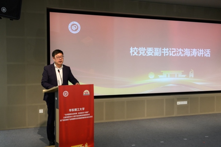 在“花梨青锋”总体国家安全观宣教服务队成立暨“行走的华理国安故事”宣讲活动启动环节,市教委后保处副处长黄峰,团市委学校工作部副部长周薇,校党委副书记沈海涛,校党委常委、党委宣传部部长柴华共同揭幕。