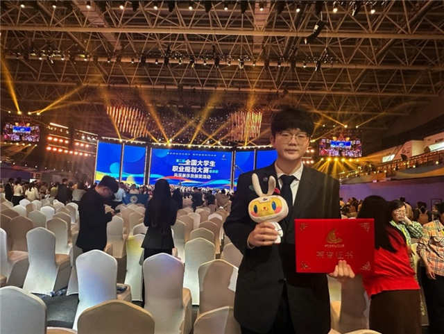 华东理工大学外国语学院2023级英语专业本科生俞文迪新近斩获第二届全国大学生职业规划大赛全国总决赛成长赛道高教组金奖。就在记者约专访报道的时候,他正在为第二天“华东理工大学2025榜样盛典颁奖仪式”进行彩排。