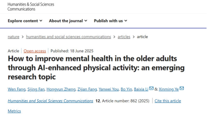 近日,华东理工大学体育学院叶心明教授团队在Nature旗下的期刊《人文社科通讯》上发表文章。本研究聚焦于如何通过人工智能促进身体活动以改善老年人心理健康,第一作者为体育学院青年教师方雯博士与硕士研究生樊思璟,硕士研究生郑洪运为第二作者,叶心明教授为通讯作者。
