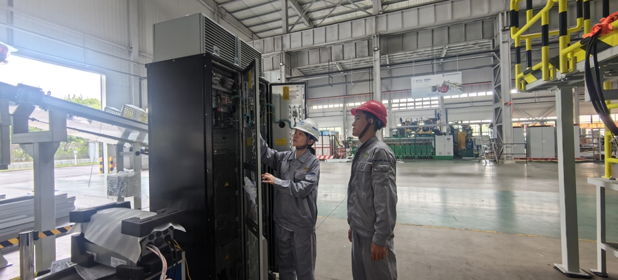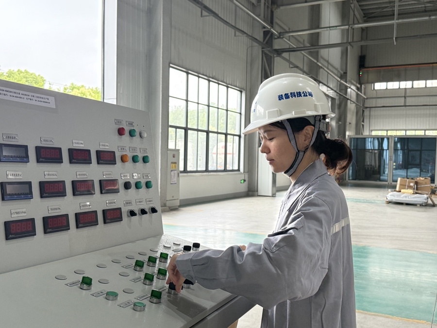 李冰玉(左)与中化学装备工程师通过工控柜设置参数。