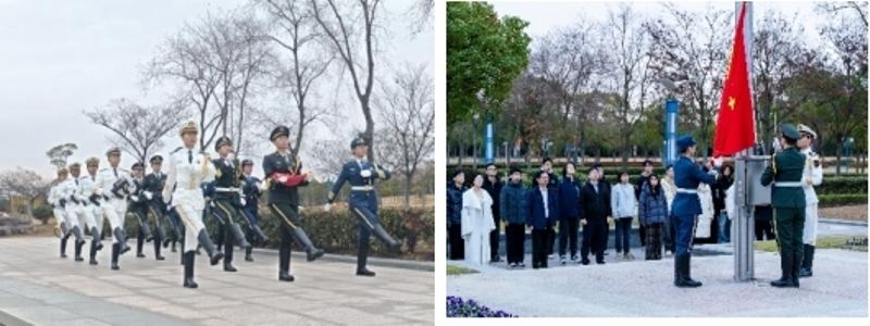 国旗护卫队步伐铿锵,五星红旗在肃穆氛围中冉冉升起。全体师生整齐肃立、行注目礼,随后垂首默哀,以无声之情寄托对逝者的哀思与追念。默哀结束,师生在国旗下高举右拳,郑重宣誓,表达继承遗志、奋发有为的决心。