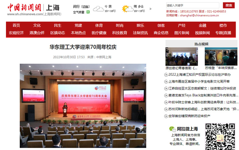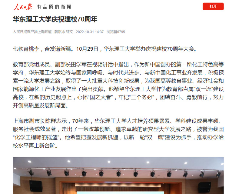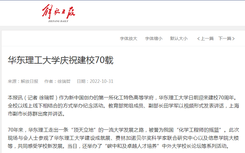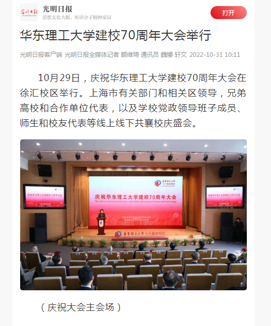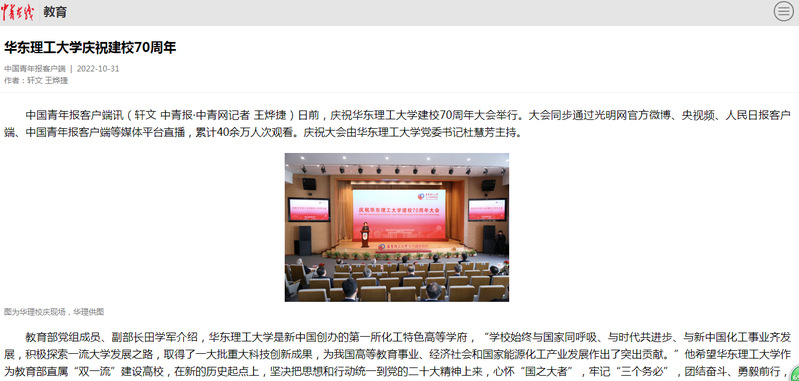10月29日,庆祝华东理工大学建校70周年大会在徐汇校区隆重举行,本次大会以线上线下相结合的方式举行,除商学院大楼406室的主会场外,还在徐汇、奉贤两校区设有多个分会场。大会同步通过光明网官方微博、央视频、人民日报客户端、中国青年报客户端等媒体平台直播,累计40余万人次观看,共襄校庆盛会。《解放日报》、人民日报客户端、光明日报客户端、中国青年报客户端、中国教育报客户端、中国新闻网、中国科技网、中化新网、澎湃新闻、上海教育电视台、东方网、第一教育、话匣子、青春上海、劳动观察、上海热线等近20家媒体原发报道,聚焦华理70周年校庆。本篇选取了部分报道予以转载。