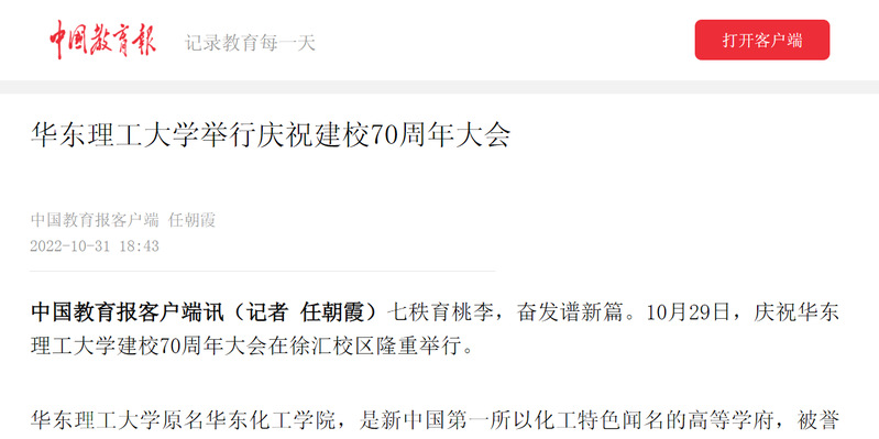 【中国教育报客户端】华东理工大学举行庆祝建校70周年大会