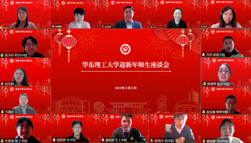 会上,沈海涛主动询问了师生们的近期身体状况、课业考试安排、离校返乡计划等,关心大家学习、生活上的困难,也向大家送上新年的祝福。他表示,2022年是极其不平凡的一年,是重重困难,更是久经考验,华理学生和老师们共克时艰、砥砺前行,展现出新时代青年自立自信、乐观向上、成熟理性、担当有为的昂扬风貌。他指出,今年是意义非凡的一年,党的二十大胜利召开,学校迎来70周年校庆,面向新时代新征程,希望广大华理青年们继续传承发扬华理的优良传统,自信自强、爱党报国、敬业奉献、勇于创新,努力学习学科知识、练就过硬本领,不断提升与人交往、团队协作、跨文化交流、文字和语言表达等方面的能力,以求真务实、守正创新、昂扬奋斗的态度面对新的一年。最后,他向长期奋战在一线的学工系统同志们表示感谢。