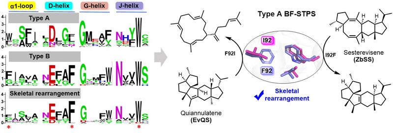 萜类化合物是天然药物宝库的重要组成部分,青蒿素、紫杉醇等明星药物均属于此类。真菌双功能二倍半萜合酶(BF-STPSs)能够通过协同催化异戊二烯链的延伸与环化,生成结构复杂且生物活性突出的二倍半萜类化合物。课题组前期研究系统揭示了G2 螺旋作为萜合酶的关键功能可塑区,基于分子动力学MD模拟指导进行蛋白质工程改造,实现了催化功能的精密转换并获得新颖萜类化合物(Angew. Chem, 2024, 63(37): e202406246; ACS Catalysis, 2025, 15: 12984)。然而,这类酶催化碳骨架重排反应的机制是领域中公认的难题。