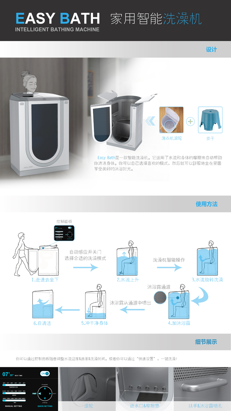“Easy Bath智能洗澡机”利用水流与身体摩擦的原理对身体的进行全方位的清洁,同时自动加入沐浴露、洗浴模式设定以及自行桶清洁等功能设定,使得洗澡变成一个释放自己、缓解压力的过程,成为享受愉悦生活的一件乐事。这是对传统洗浴的颠覆,使洗浴从主动劳动变成被动享受,从“浴室”这一家居空间的束缚中挣脱出来。
