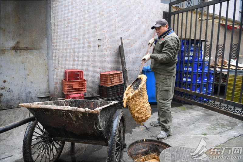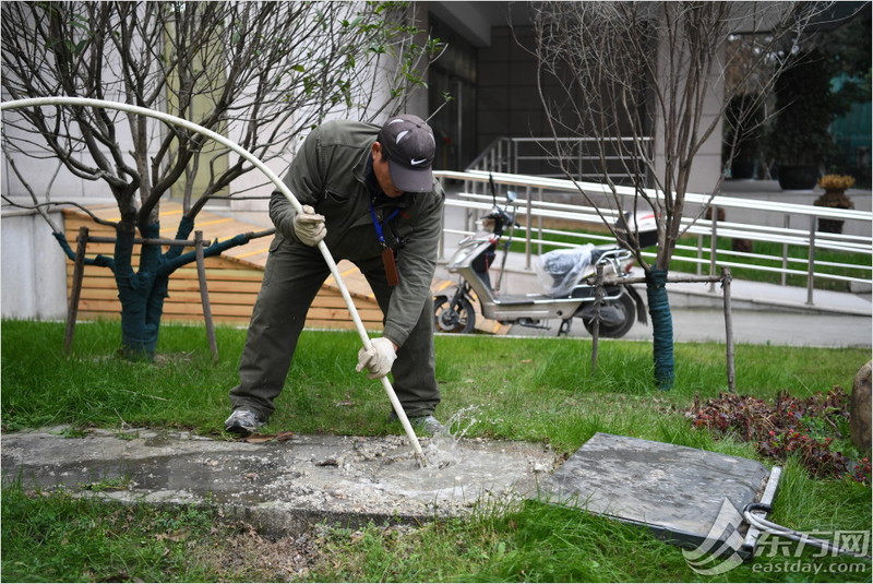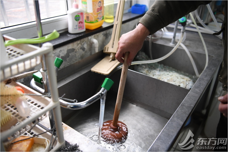 在华东理工商学院,朱小清着手疏通堵塞的下水道。