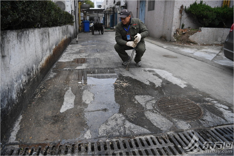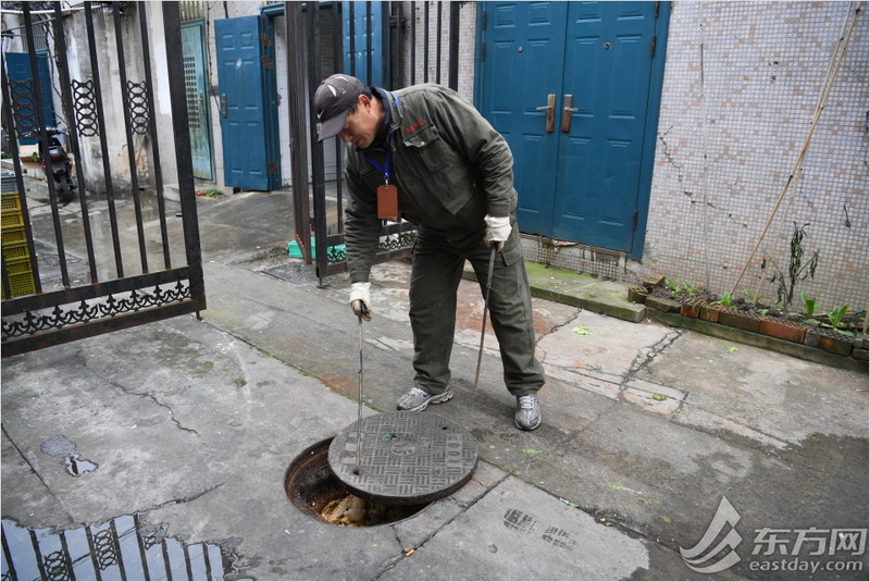 熟练地用工具掀开下水井盖后,朱小清在确认堵塞的情况。