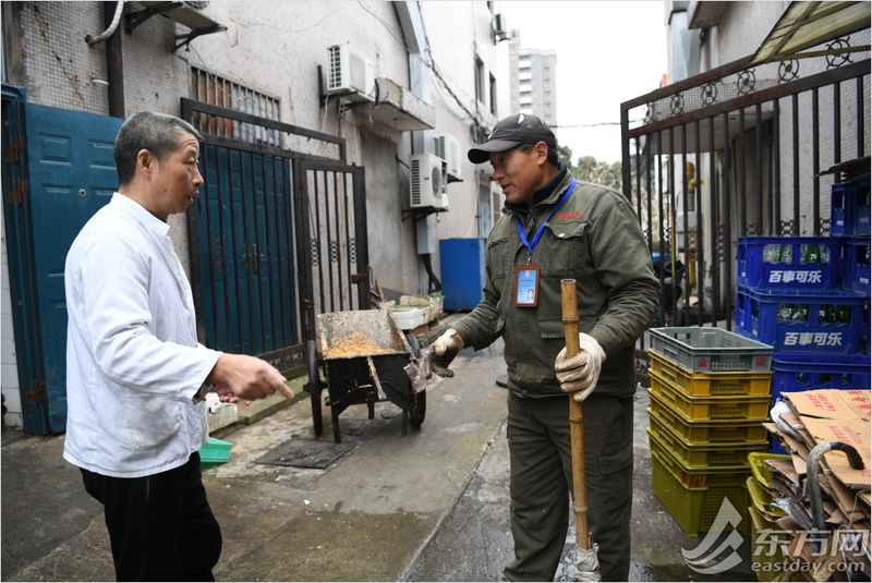 食堂的工作人员正在与朱小清沟通下水道堵塞的情况。