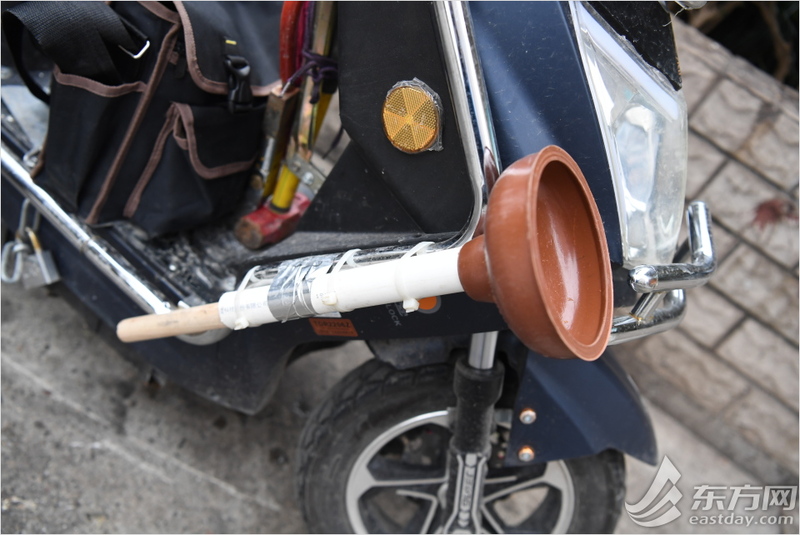 放在朱小清电动车上的下水道疏通工具。