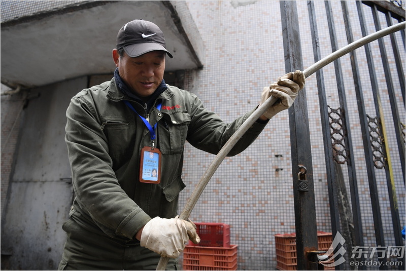 朱小清正在疏通堵塞的下水道。像这样的工作,他一天平均接到10多单,多的时候要到20多单,从早到晚。