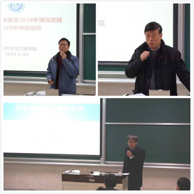 为扎实推进学院2019年国家自然科学基金申报工作,助力学校“双一流”建设,1月10日,材料学院在徐汇校区四教102室举行了2019年国家自然科学基金申报专题动员会。学院党委书记唐颂超、副院长(主持工作)林绍梁及全体教师参会。会议由唐颂超主持。