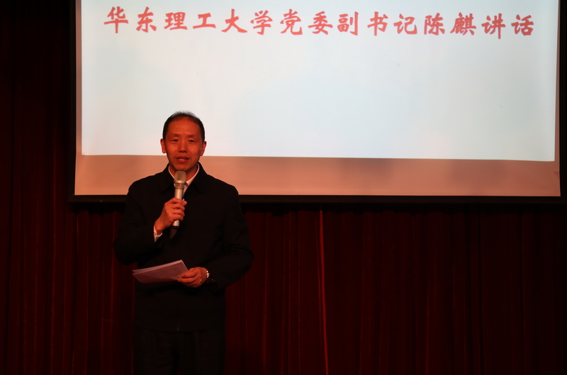 陈麒代表校党委书记杜慧芳和校长曲景平向学校全体盟员致以最亲切的问候,并对民盟华理委员会过去一年的工作和盟员们为学校取得的荣誉表示感谢。他向新老盟员介绍了学校2018年在学科建设、对外支援、校区基本建设、改善学生学习、生活环境和党建工作等方面取得的成绩。他表示,在新的一年里,校党委将继续支持民盟基层组织的建设与发展,希望老师们也持续关注学校的发展,继续为学校的各项事业作出贡献。