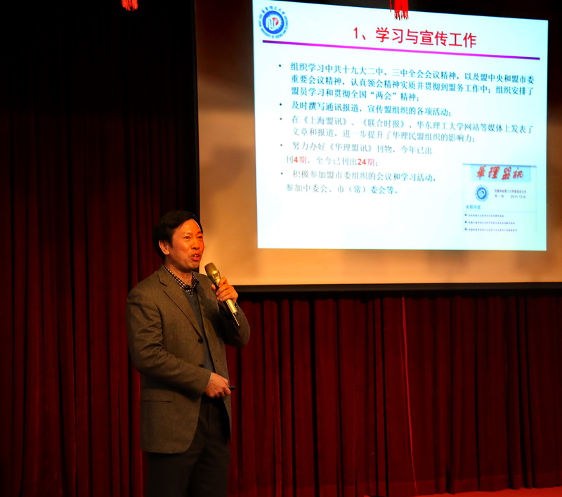 团拜会的第二部分由常务副主委安琦主持。黄发荣首先向大家作了2018-2019年民盟华理委员会工作报告,对民盟市委、学校党委对民盟组织的大力支持与帮助表示感谢,介绍了我校民盟组织的发展概况以及民盟华理委员会第十五届委员会基本情况,从学习和宣传、参政议政、组织工作、盟务工作、盟务工作拓展、本职工作、集体获奖及盟员获奖八个方面详细介绍了2018年的具体工作情况,并对2019年的工作进行了展望。他表示,2019年,民盟华理委员会将继续加强推进盟员思想建设、参政议政、盟务拓展、组织建设等工作,力争再立新功。