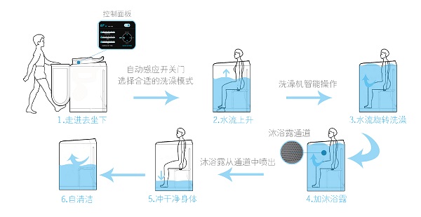 洗澡机的外型就像是一个普通的洗衣机,只不过,这回洗的是人。操作简单,打开门,进去入座,就可以洗澡了。陈德芳介绍,这个设计灵感就来自于洗衣机,利用水流与身体摩擦的原理,对身体进行全方位的清洁。同时,自动加入沐浴露、洗浴模式设定及自行桶清洁等。功能设定使得洗澡变成一个释放自己、缓解压力的过程,成为享受愉悦生活的一件乐事。