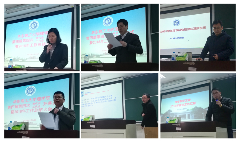 1月24日上午,理学院在徐汇校区四教102举行第四届第四次教代会、工代会开幕式暨2018年度学院工作总结大会。学院党政领导班子成员及全体教职工出席会议。会议由学院工会主席陈建华主持。