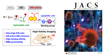 阿耳茨海默症(AD,俗称老年痴呆症)是一种严重的中枢神经系统变性病。研究表明,大脑中β-淀粉样蛋白(Aβ)斑块被认为是该疾病早期诊断和治疗的重要病理学标志。近日,化学学院郭志前和朱为宏教授课题组在近红外荧光分子探针对Aβ斑块进行原位成像研究方面取得重要突破,相关成果以“Rational Design of Near-Infrared Aggregation-Induced-Emission-Active Probes: In Situ Mapping of Amyloid‑β Plaques with Ultrasensitivity and High-Fidelity”为题发表在国际一流期刊《美国化学会志》(J. Am. Chem. Soc., 2019, 141, pp 3171–3177),并被选为封面文章。