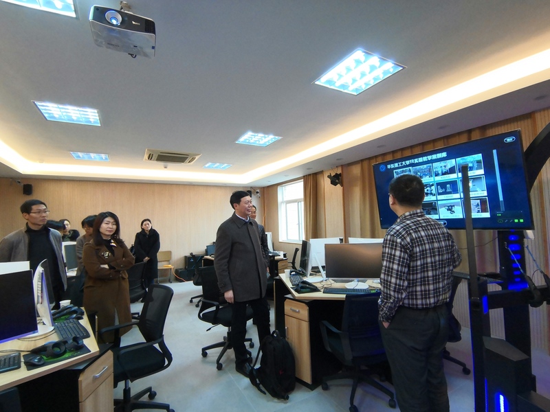 张开富在交流中表示,华东理工大学为西北工业大学思政工作精准施策提供了很好的借鉴,希望双方能继续保持联系,进一步深入学习,加强交流互访。调研期间,嘉宾一行赴创新创业教育中心实地走访,并参观体验了虚拟现实教学实验室。创新创业教育中心副主任司忠业介绍了虚拟现实教学实验室的建设成果,技术负责人蔡方向嘉宾展示了我校虚拟现实教学的实际应用情况。嘉宾们通过自主操作VR头盔和手柄设备,在逼真的环境、多变的场景中体验虚拟现实教学。