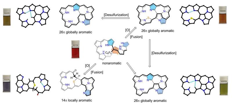 卟啉广泛存在于叶绿素和血红素等自然界功能体系中,具有重要生理活性和突出光电性能。通过改变卟啉四吡咯大环框架而发展起来的异卟啉,在离子识别、超分子组装、荧光探针、多金属配位、近红外功能染料等领域具有独特的优势和良好的应用前景。其中,关于异卟啉大环之间转化反应的研究有助于发展新型异卟啉骨架,从而进一步拓展结构与性能,具有重要价值。解永树教授课题组在该领域前期系列研究基础(Chem. Sci., 2019, 10, 2186; Chem. Rev., 2017, 117, 2203; Angew. Chem. Int. Ed., 2016, 55, 3063; JACS, 2015, 137, 14055; Chem. Soc. Rev., 2015, 44, 1101; Angew. Chem. Int. Ed., 2014, 53, 10955; Angew. Chem. Int. Ed., 2014, 53, 14069; JACS, 2013, 135, 19119))上,发展了一种调控异卟啉大环结构与芳香性的新策略:将噻吩单元引入卟啉体系,创造性地利用错位吡咯单元活化噻吩的开环与脱硫反应,实现有趣的大环重排反应和独特的骈连结构,成功合成具有特殊整体芳香性与局部芳香性的新型异卟啉。基于该方法,可进一步设计、合成具有独特结构与性能的新型异卟啉,拓展结构与功能,应用于新型有机光电功能材料等领域。