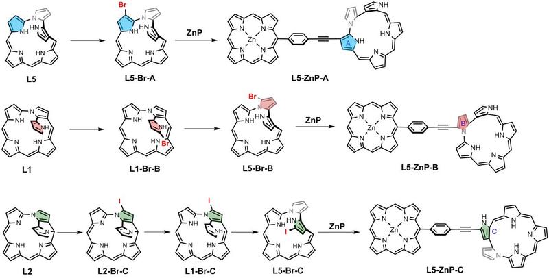 两个卟啉相连形成的多卟啉化合物相比单个卟啉具有更为特殊的性质,如分子内能量/电子转移、双光子吸收、非线性光学等性能,可应用于诸多领域。但是,目前仍然缺乏构建二聚卟啉,尤其是异卟啉-卟啉二聚体的有效策略。解永树教授课题组巧妙地将前期发展的大环转化策略与高效卤代反应有机结合,成功合成三种新型五卟啉的高区域选择性单卤代中间体,并进一步通过Sonogashira反应与锌卟啉炔偶联,成功构建三个不同吡咯位点键连的异卟啉-卟啉二聚体。结果表明,二聚体分子内存在从卟啉到异卟啉的可控能量转移过程。有趣的是,与α键连的二聚体相比,β键连方式具有更高的分子内能量转移效率。基于该策略,可进一步设计合成具有独特结构与性能的异卟啉二聚或多聚体,拓展多卟啉类化合物的功能,应用于有机光电功能材料等领域。