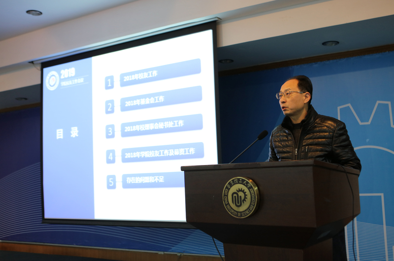 校友与发展联络处处长李建伟汇报了2018年我校校友会及基金会的主要工作,对2018年各学院校友工作及募资工作的总体情况进行了总结,并指出当前学院校友工作中存在的问题和不足。