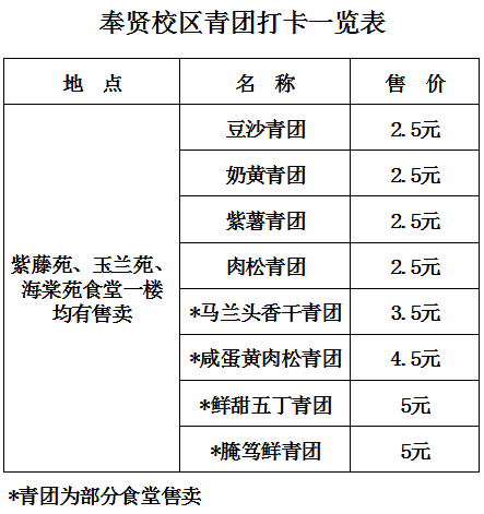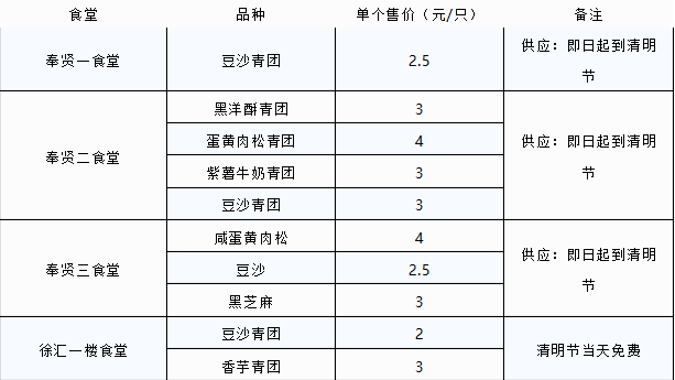 地点时间:销售地点:北区食堂一楼、旦苑一楼、江湾食堂一楼、枫林食堂一楼、南区食堂二楼(3月16日开始供应)、张江食堂一楼(4月1日开始供应)