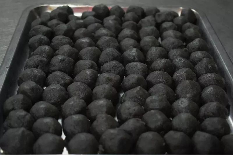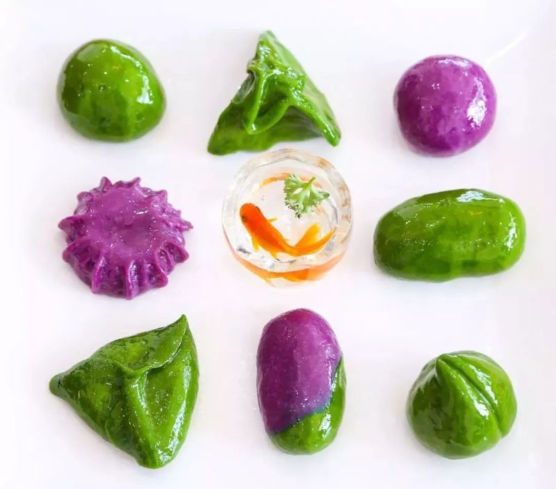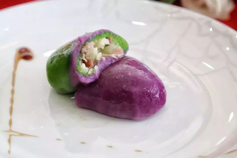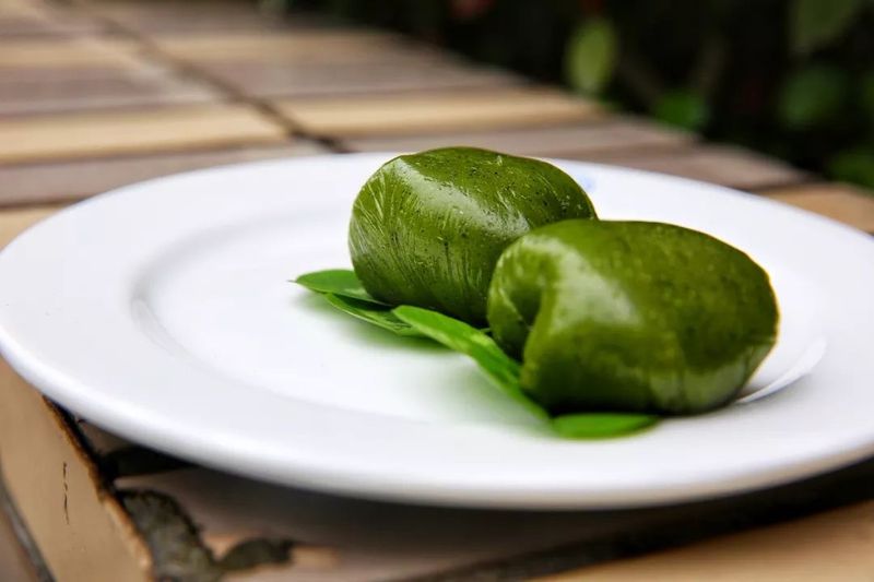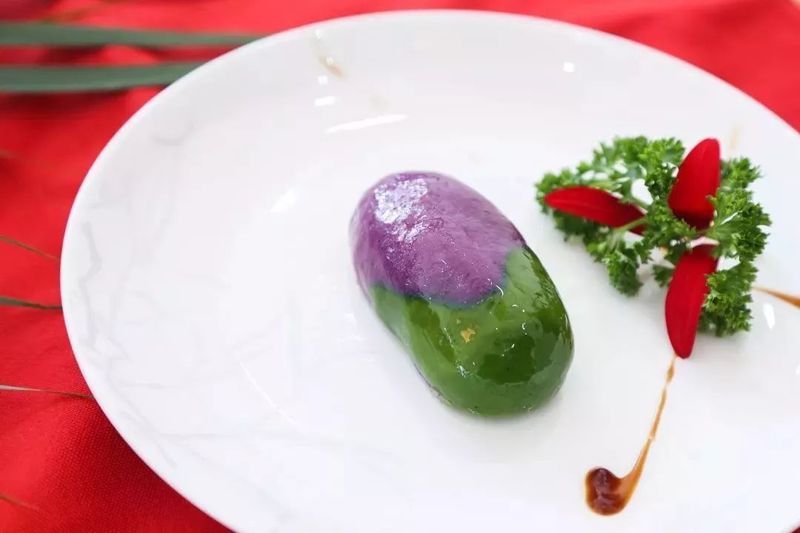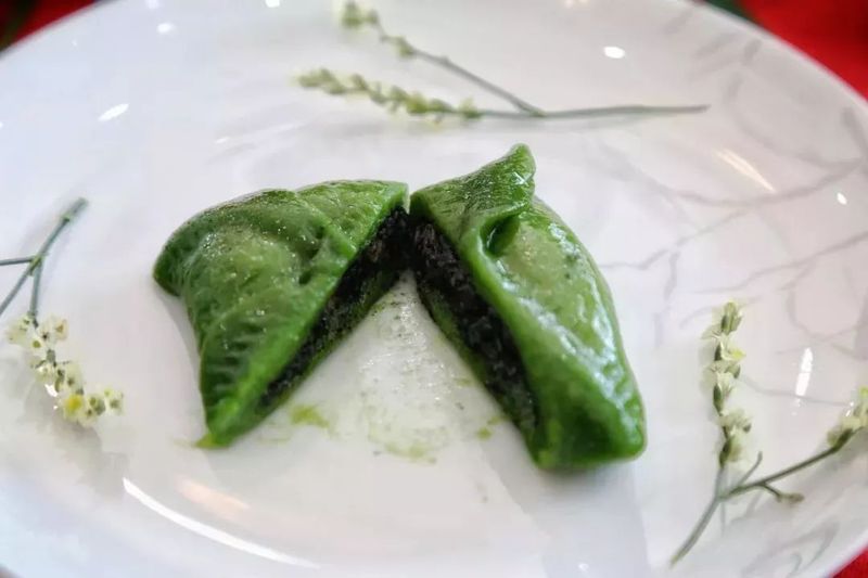 咖啡色的豆沙馅青团、紫色马兰头馅青团