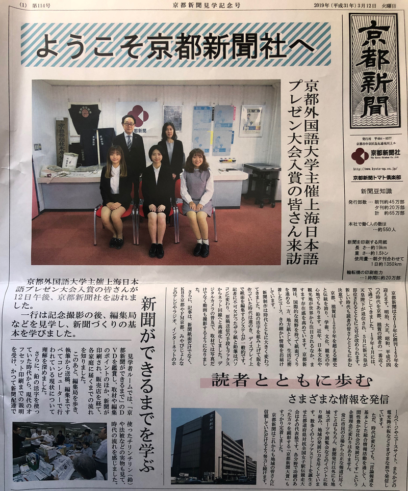 此次文化访学交流活动中,3名学生参与了同日本京都外国语大学中文系师生的交流会,就外语学习的感受及中日两国年轻人的生活进行了深入交流。学生们参观《京都新闻》报社,了解了报纸的制作流程,并访问了山口县和福冈县,体验了日本不同地区的民俗民风文化。《京都新闻》报还对她们的来访进行了报导。