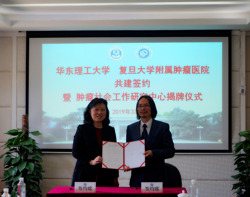 3月19日,在第13个国际社工日来临之际,华东理工大学—复旦大学附属肿瘤医院肿瘤社会工作研究中心(以下简称“研究中心”)在我校社会与公共管理学院正式揭牌成立。我校党委书记杜慧芳,复旦大学附属肿瘤医院党委副书记顾文英,我校社会与公共管理学院党委书记张广利、院长何雪松,以及高校社会工作系师生、医院医护人员代表共计30余人参加了合作协议签约及研究中心揭牌仪式。仪式由张广利主持。