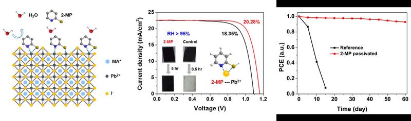钙钛矿薄膜表面存在大量结构缺陷(如未配位的Pb2+等),其不仅会俘获光生载流子造成能量损失,还容易吸附环境中的水和氧等,加速钙钛矿薄膜退化过程。以往,研究者们曾尝试利用包含Lewis 酸或Lewis碱单元的有机分子作为表面钝化材料来消除缺陷、提升钙钛矿光电性能,但所采用的钝化试剂普遍面临与钙钛矿表面结合力弱、钝化效果不稳定的缺点。为了提高钝化剂分子和Pb2+的键合强度,该课题组首次提出了通过形成螯合结构来提升钝化稳定性的新颖策略,发展了基于2-巯基吡啶(2-MP)的高效双齿钝化剂。高效稳定的钝化使CH3NH3PbI3电池获得20.28%的光电转化效率,开路电压最高达到1.18 V,且能够在60%—70%高湿度环境中表现出良好的稳定性。该工作成果以“Efficient and Stable Chemical Passivation on Perovskite Surface via Bidentate Anchoring”为题,发表于Adv. Energy Mater.。