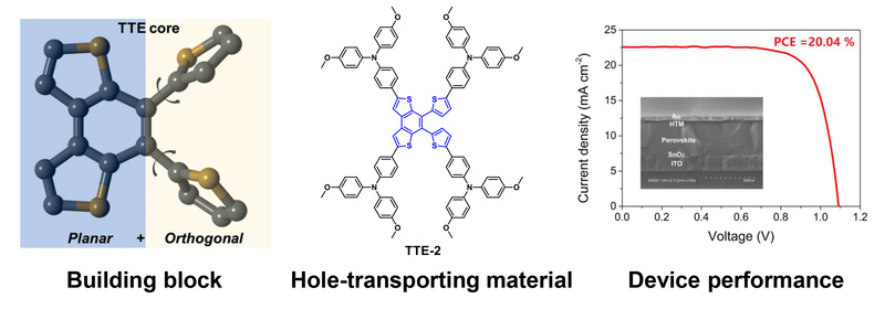 有机空穴传输材料(HTM)作为钙钛矿太阳能电池的重要组成部分,可以起到促进空穴提取和阻挡电子的作用。获得高的空穴迁移率和薄膜质量是提升器件性能的关键,但是两者往往很难兼顾,其主要原因是缺乏可有效调控分子构型的设计模块。该课题组创新性地引入了构象可调的四噻吩乙烯(TTE)作为核心单元,通过将其中一对顺式噻吩化学关环得到半锁的TTE单元,其特殊的平面—正交杂化构型实现了迁移率和薄膜形貌的完美平衡,无需复杂的化学掺杂过程即可使钙钛矿太阳能电池效率超过20%,这是目前无掺杂HTM钙钛矿太阳能电池的最优效率。该工作成果以“Semi-Locked Tetrathienylethene as Building Block for Hole‐Transporting Materials: Toward Efficient and Stable Perovskite Solar Cells”为题,发表于Angew. Chem. Int. Ed.。