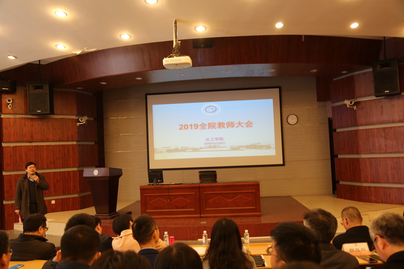 化工学院于3月22日中午在六大召开全院教师大会。学院党委书记朱学栋,院长李春忠,党委副书记高艺霞,副院长方波、刘殿华和赵双良等学院领导及教师150余人参加了会议。会议由朱学栋主持。