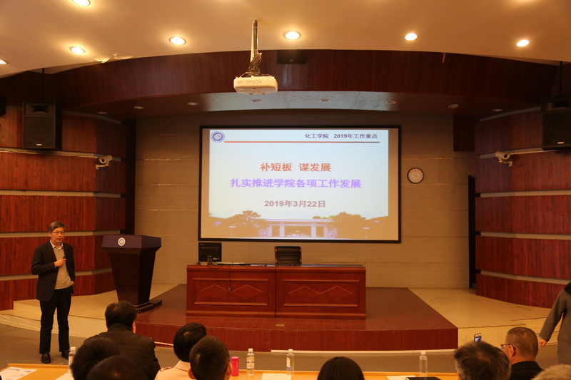 李春忠作了题为“补短板,谋发展,扎实推进学院各项工作发展”的讲话。他首先介绍了化工学科的沿革与发展、学科发展现状和学院教师队伍现况,指出2019年学院工作重点是化学工程与技术一流学科建设、凝练学科方向、推进高端人才引进与培养、进一步提升国际影响力。李春忠分析了未来发展的困难点,提出了应对策略,并指出人才队伍建设是重点工作,要培养与引进并重,坚持人才强院战略。他对学院的学科建设、本科教育、研究生培养等各项工作提出了具体目标、促进办法与措施,强调了实验室安全管理工作的重要性,介绍了学院在推动安全保障方面的多项举措。最后,李春忠希望全院教师凝心聚力,砥砺奋进,共同努力,推进学院发展。