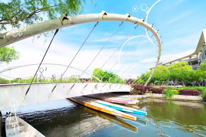 在上海应用技术大学奉贤校区河流之上,矗立着一座美丽的拱形小桥。小桥雅致,处于绿树繁花之下,点缀于菁菁校园之中,成为上应大校园里一道独特的美景。在桥上驻足看两边的风景,杨柳依依,绿水潺潺。一路徜徉,脚下的路因为桥多了一份诗意,也因为桥多了一份坚定。师生们说说笑笑的走着,小桥上川流不息。寒来暑往,它伴着学生的成长,伴着师生的希望。