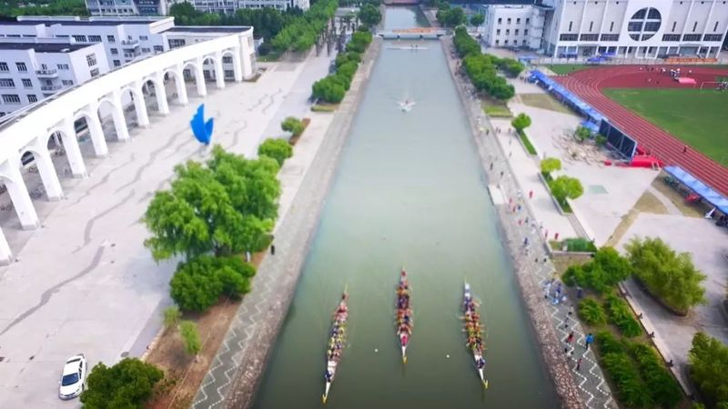 小桥流水龙舟,学子求学殿堂,映阶碧草自春色,寻觅灯火夜阑干的—育青桥。