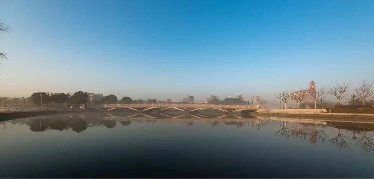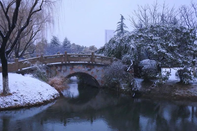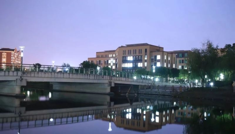 太阳东起西落,桥畔波光粼粼,学子谈笑往来。诚信桥沟通学区与宿舍,两侧植有翠竹与腊梅,希望学子们为人刚正,求学持之以恒。前进路上,有风雪载途,更有香自苦寒来的信念。
