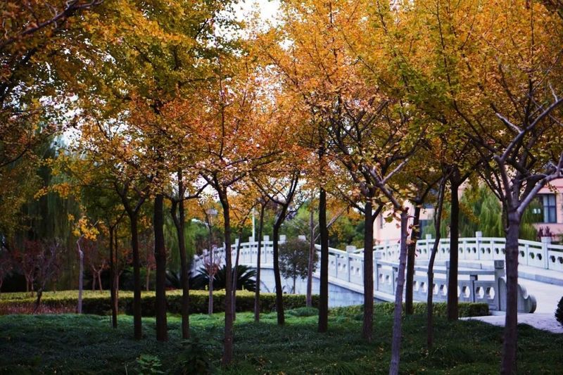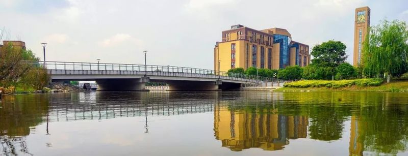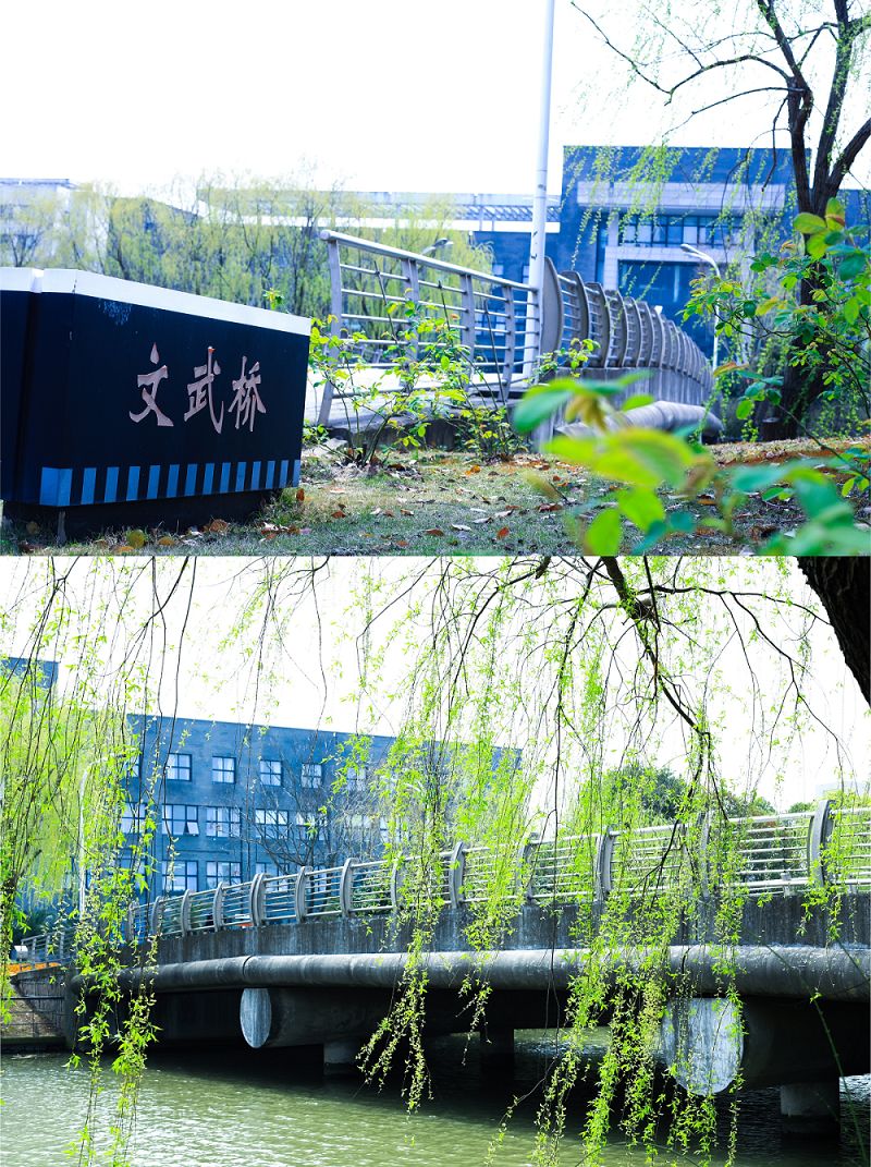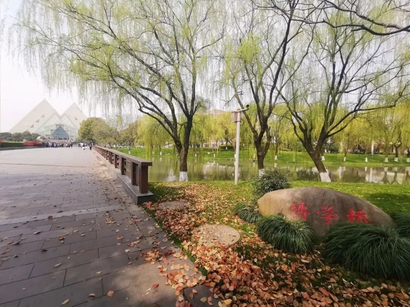 博学桥正对校门与图书楼。林荫道至,杨柳依依,如名所盼,工大学子勤奋,广博求知为学。