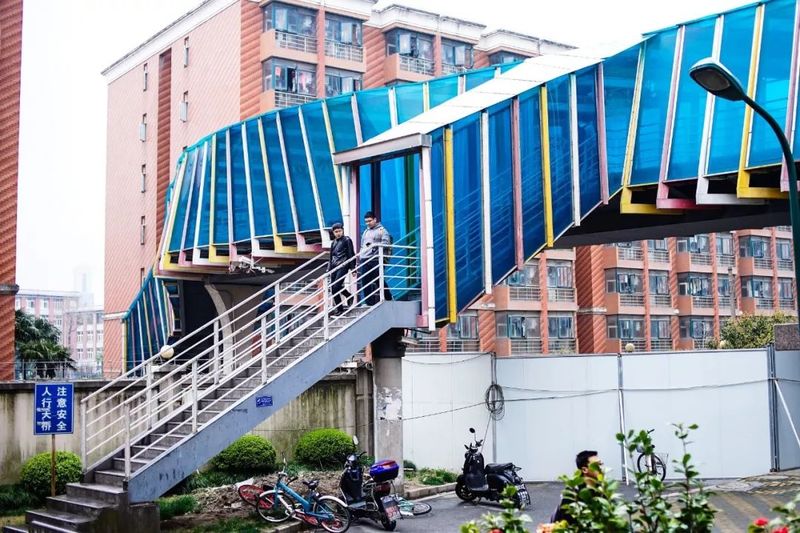 海安路上的彩虹桥,是上海理工大学军工路校区南北区的必经之路。在桥体海蓝色的光影中,每天来回着学子们上下课的忙碌身影。晴天为他们遮一段烈日,雨天为他们挡一些风雨。“桥都坚固,隧道都光明。”兼顾桥与隧道的外形的海安路桥,是坚固而又光明的。