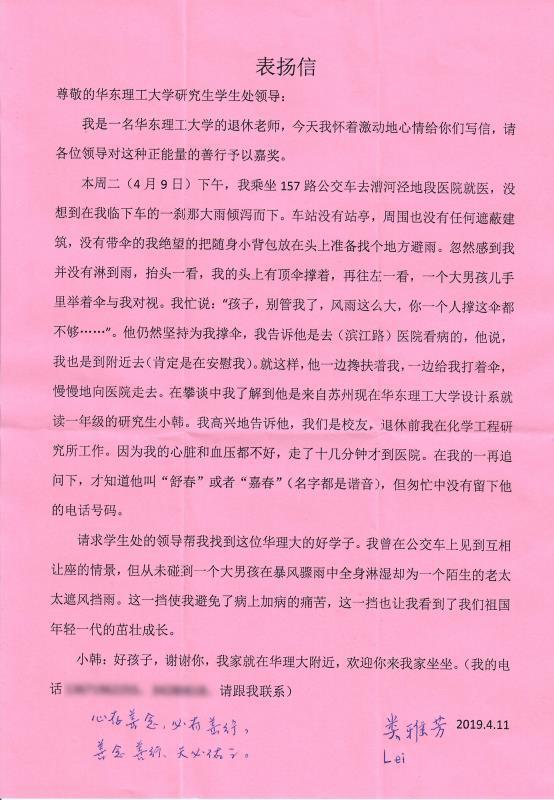 我是一名华东理工大学的退休老师,今天我怀着激动地心情给你们写信,请各位领导对这种正能量的善行予以嘉奖。
