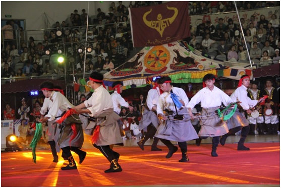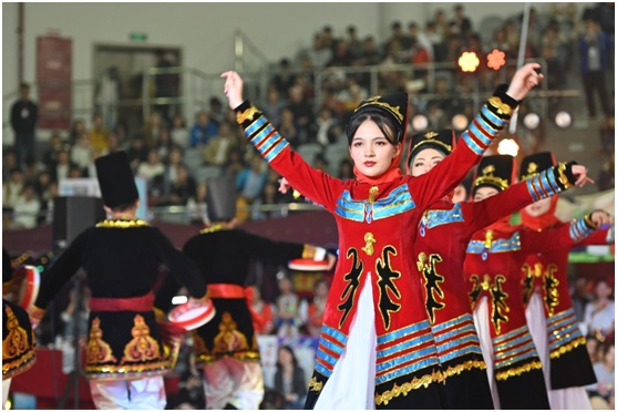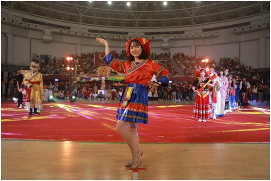 刚柔并济的维吾尔族舞蹈《刀郎》,神秘古老的《满族婚礼》,壮族的《竹竿舞》,朝鲜族歌舞表演《阿里郎》,蒙古族独舞《梦中的额吉》……异彩纷呈的表演引来了师生经久不息的掌声。