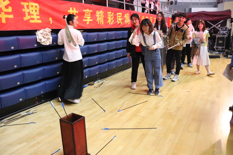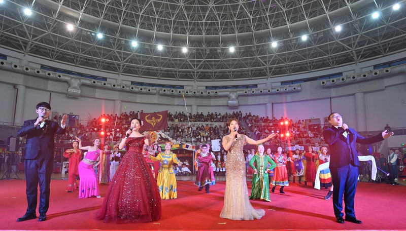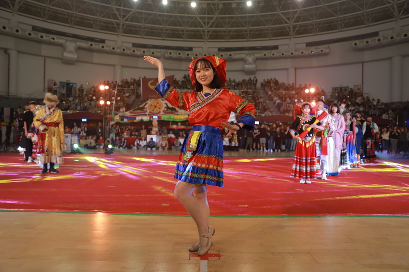 场馆四周陈列着大大小小的民族展示摊位。师生们在欣赏节目之余,也可以走入各民族摊位,与各民族师生近距离互动,感受不一样的民族文化。美味的民族小吃、风情各异的民族服饰、制作精美的民族工艺品等陈列其上,让师生们流连忘返、称赞不已。民族知识问答、民族文化体验、民族工艺品手工制作等,将“文化”与“娱乐”相结合,这样别具新意的交互模式让师生们深刻地感受到民族文化的独特魅力,更彰显了“中华民族一家亲”的理念。最后,在欢快悠扬的民族乐声中,各族学生共同跳起了集体舞蹈,让现场所有人都亲身体验了不同民族间的文化碰撞与交融。整场活动在和谐、欢快和感动的气氛中落下帷幕。