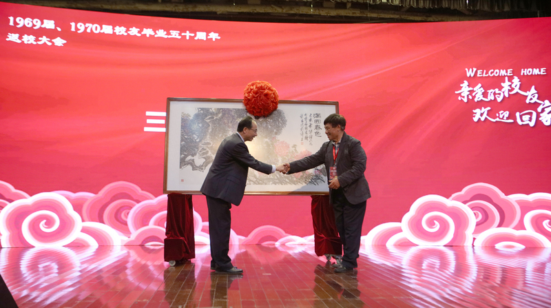 “落其实者思其树,饮其流者怀其源”。虽然毕业多年,69、70届校友仍然心系母校,关心母校发展。阳安江和刘志峰两位校友分别当选为新一届学校理事会理事长和副理事长,为学校发展建言献策,咨询把脉,提出了很多宝贵意见和建议。为了表达对母校培育的深情厚谊和感恩之情,两届校友慷慨解囊,专门筹集了12万余元支持学校教育事业发展。无52班朱玉梅校友代表两届校友向学校捐赠支票,著名海派画家、2142班张关林校友绘制了以牡丹为主题的国画《满园春色》,机43班袁涛校友携作品《归来》赠与母校,共同祝愿母校发展蒸蒸日上、早日迈入一流大学的行列。校友与发展联络处处长、基金会秘书长李建伟代表学校接受捐赠。