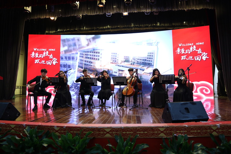 在欣赏了由大学生艺术团的学弟学妹带来的弦乐演奏《瑶族舞曲》之后,上午9点30分,1969、1970届校友毕业50周年返校大会正式开始。大会由副校长吴柏钧主持。